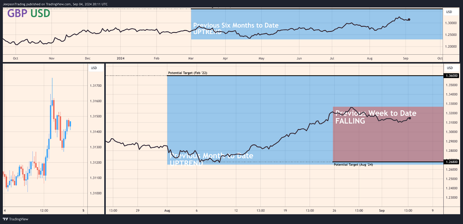 The bullish thesis for the GBP/USD pair has a moderate conviction level. The weakening US dollar and the potential for further Federal Reserve rate cuts, coupled with the BoE's cautious approach to monetary policy and the potential for positive surprises in UK economic data, suggest that the British pound could continue to strengthen against the US dollar in the near term. However, the potential for a resurgence of risk aversion in global markets and the upcoming release of the UK GDP data for Q2 pose risks to this outlook. The uptrend observed during the month to date, following an uptrend in the previous month, suggests that the pair could continue its upward trajectory in the upcoming month, potentially targeting towards 1.360.