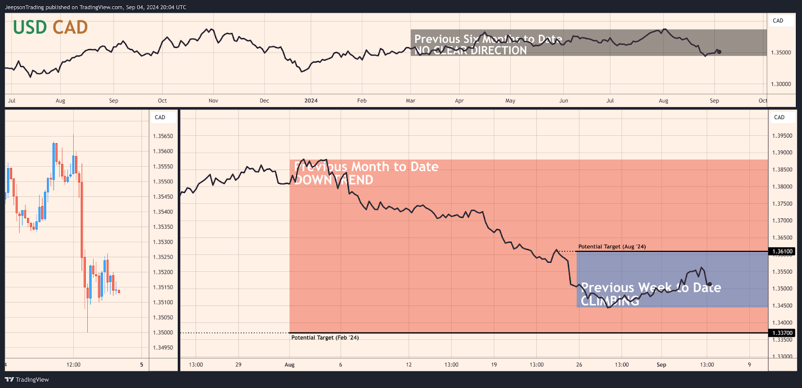 A thesis for the USD/CAD pair to climb during the upcoming week is based on the potential for a smaller-than-expected rate cut by the Fed or a more hawkish tone from the Federal Reserve. This could occur if upcoming economic data releases, such as the US Non-Farm Payrolls for August (due Friday, September 6th, Week 36), point to a more resilient US economy. A smaller rate cut by the Fed or a more hawkish tone could strengthen the US dollar and weigh on the Canadian dollar, leading to an appreciation of the USD/CAD pair.