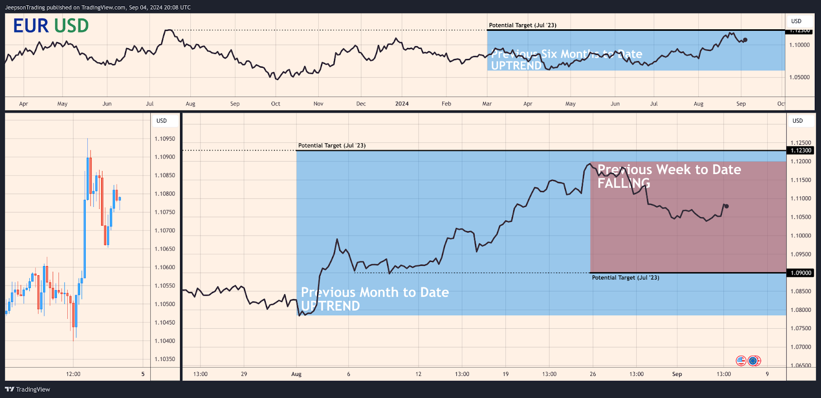 The bearish thesis for the EUR/USD pair has a moderate conviction level and is most likely. The strengthening US dollar, potential Federal Reserve rate cuts, and the ECB's cautious approach to monetary policy suggest continued euro weakness against the US dollar in the short term. However, the potential resurgence of risk aversion and the upcoming Euro-Area GDP data release pose risks. The steady performance of the EUR/USD pair during the month to date, following an uptrend in the previous month, suggests that the pair could continue its upward trajectory in the upcoming month, potentially targeting 1.123.