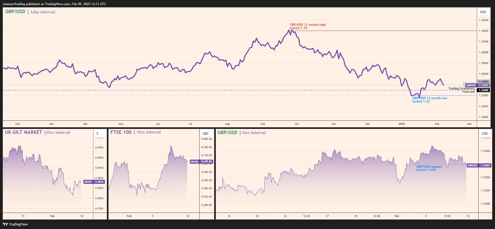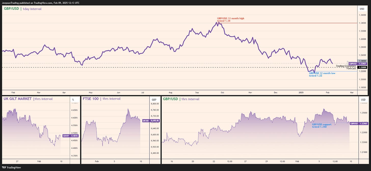 The British Pound (GBP) has been under pressure from the Bank of England's (BoE) dovish monetary policy and concerns about the UK's economic slowdown. The BoE's rate cut to 4.5% on February 6th, along with weak economic data (construction PMI, retail sales, consumer confidence) and the BoE's downward revision of growth forecasts, has reinforced the negative sentiment.