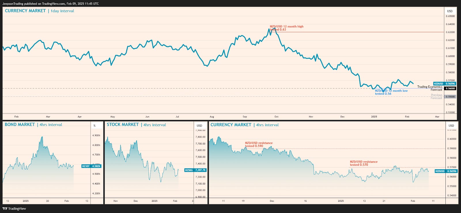 The dominant theme for the NZD remains the RBNZ's dovish monetary policy and the ongoing technical recession. The NZD has been under pressure from weak domestic demand, contracting manufacturing and services sectors, and the RBNZ's clear easing bias. More recently, weak Q4 employment data, showing a rise in the unemployment rate to 5.1%, has further solidified expectations of a 50 bps rate cut at the RBNZ's February 19th meeting.