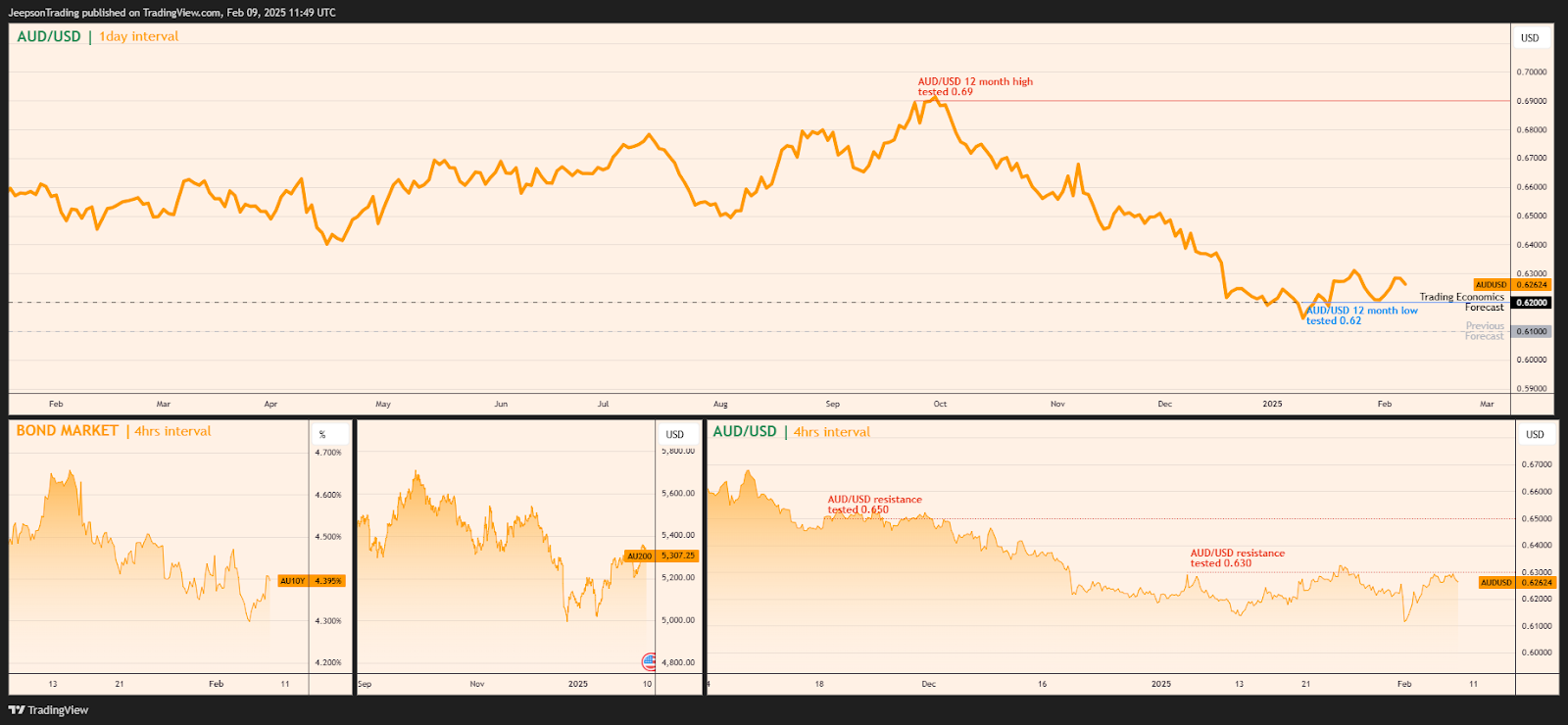 The dominant theme for the AUD has been the increasing likelihood of RBA rate cuts, driven by weaker-than-expected Q3 GDP growth and dovish commentary from RBA officials. This narrative intensified recently with the release of softer-than-expected Q4 inflation data (2.4% YoY), further cementing rate cut expectations. The narrowing trade surplus in December added to the AUD's woes.