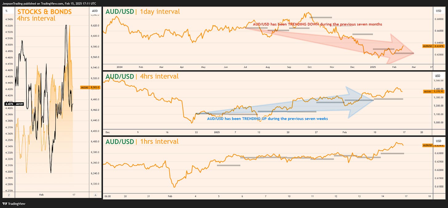 The dominant theme for the AUD over the past seven weeks has been the increasing likelihood of RBA rate cuts, fuelled by weaker-than-expected Q3 GDP growth and dovish RBA commentary. This was reinforced by the softer-than-expected Q4 inflation print of 2.4% YoY (released Jan 29th). The dominant narrative over the past seven days has been more positive, driven by a combination of AUD strength (closing above $0.632 on Feb 14th), surging iron ore prices (up 2.11% on Feb 14th), and signals from the PBoC (on Feb 14th) indicating a willingness to adjust policy to support growth.