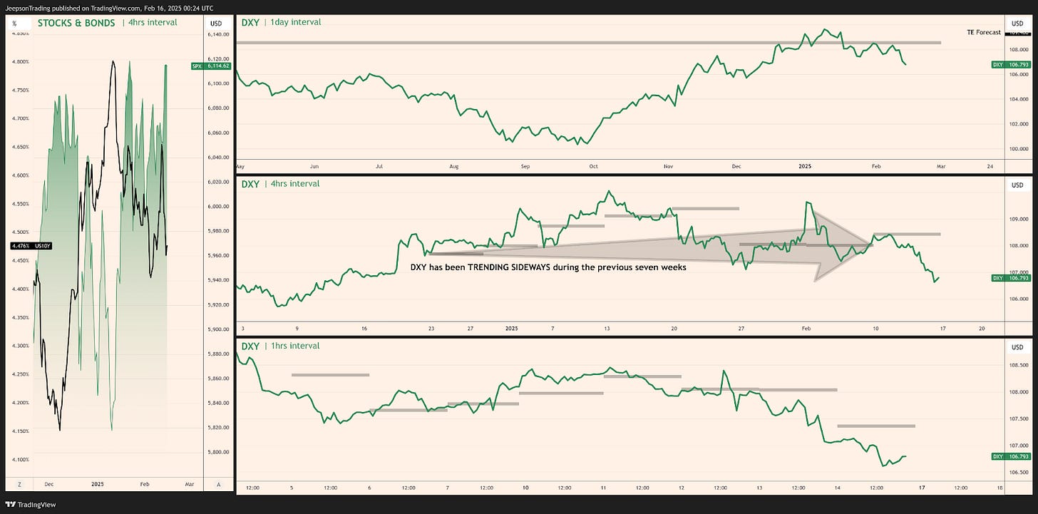 The dominant theme for the USD over the past seven weeks has been the strength driven by safe-haven demand and the Fed's relatively hawkish stance. Trump's trade policies and the tech sell-off fuelled risk aversion, supporting the USD. The Fed held rates steady in January, signalling a pause after three cuts in 2024. The dominant narrative over the past seven days has been a shift towards risk-on sentiment and easing trade tensions. The USD weakened, falling below 107 on Feb 14th, as the tariff delay and hopes for a Ukraine peace deal boosted risk appetite. However, weaker retail sales and rising import prices raised concerns about the US economy.