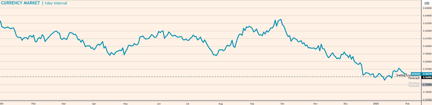 The New Zealand dollar is still nursing a recession hangover. The Q3 contraction of -1% and weak domestic demand have painted a bleak picture, and the RBNZ's dovish stance isn't helping. The market's fully priced in a 50 bps rate cut on February 19th – no surprises there. The Luxon government's fiscal stimulus, with tax cuts and infrastructure spending, is a potential bright spot, but it's a long game.