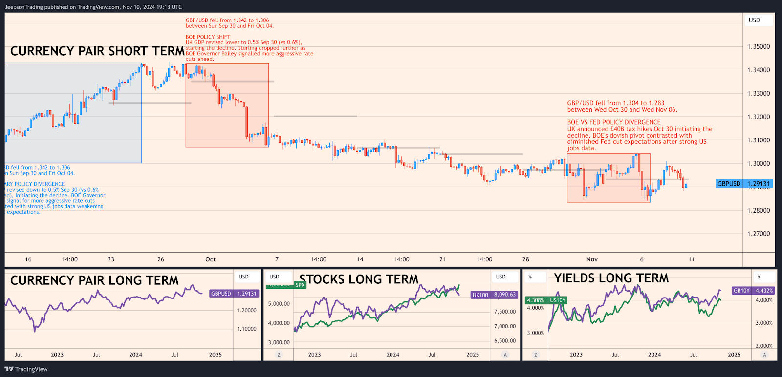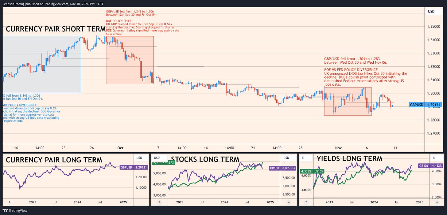 What's happened lately? The pound fell to $1.285 last week, its lowest price since August. This happened for two main reasons. First, the Bank of England cut interest rates to 4.75%, with 8 out of 9 officials voting for the cut. Second, Trump's election win made the dollar stronger. The UK government also announced plans to raise taxes by £40 billion, which made some traders worry about the UK economy.