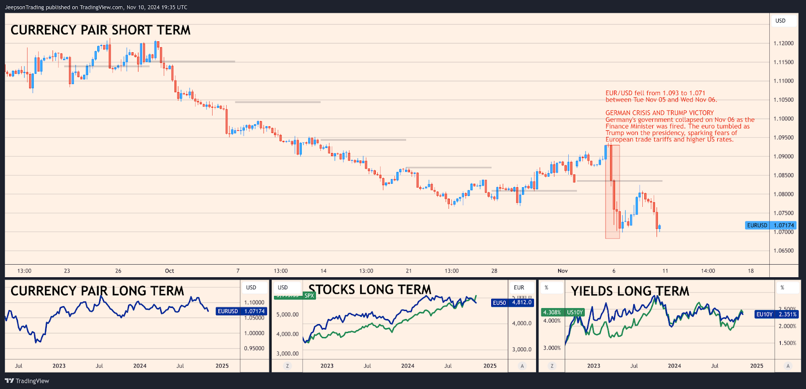 Last week, the euro had its biggest drop since March 2020, falling to $1.072. This happened because Trump won the election and because Germany (the biggest economy in Europe) is having some political problems. The European Central Bank also cut its interest rate to 3.25%. However, there was some good news - the European economy grew by 0.4% last quarter, which was better than expected.